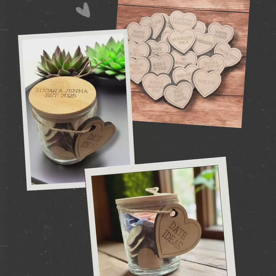 Enjoy playful and personalized date night jars, perfect for every couple. Choose from small jars with 20 creative date ideas or large jars offering 30 exciting options.